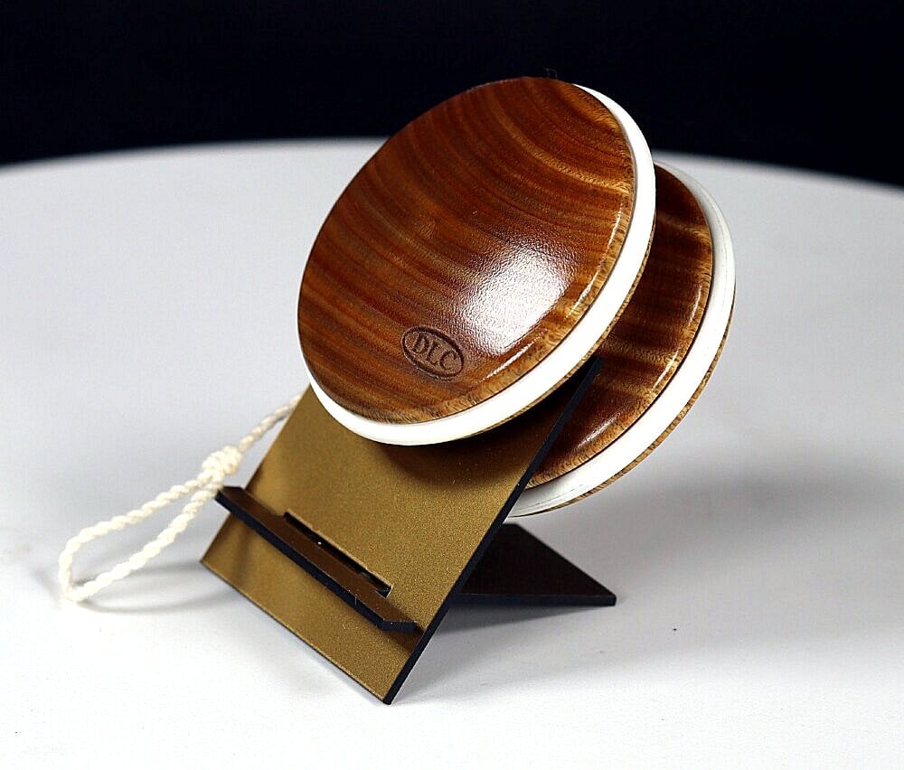 100% handmade and lathe turned here in my Colorado shop, from a solid block of wood, with no glue holding the sides and axle together. Fixed axle, with a "nickel" width (~2.0 mm) string gap for responsive play, but sleeps easily as well (slick axle). Perfectly balanced, and a true and very smooth spinner. Measures a small-ish 2.10" x 1.30" and weighs in at 65 grams (with string).