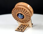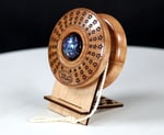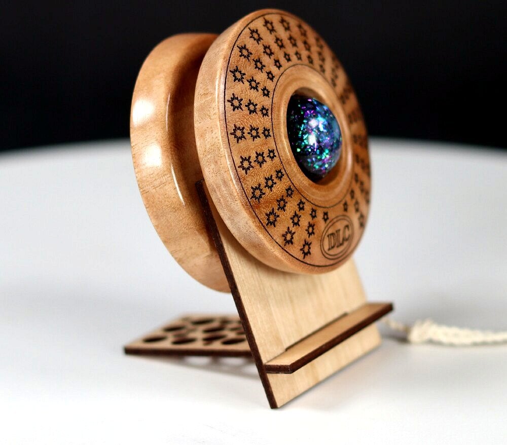 Completely handmade, lathe turned from a single block of wood, with no glue holding the sides and axle together. Fixed axle, with "nickel" width (~2.mm) string gap for responsive play, but will easily sleep and return with a slight string tug. Perfectly balanced and a super smooth player. Measures about 2.25" x 1.75" and weighs in at 60 grams (with string).