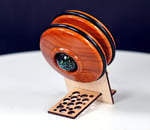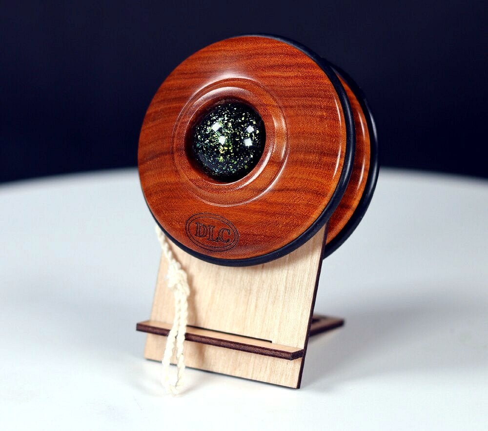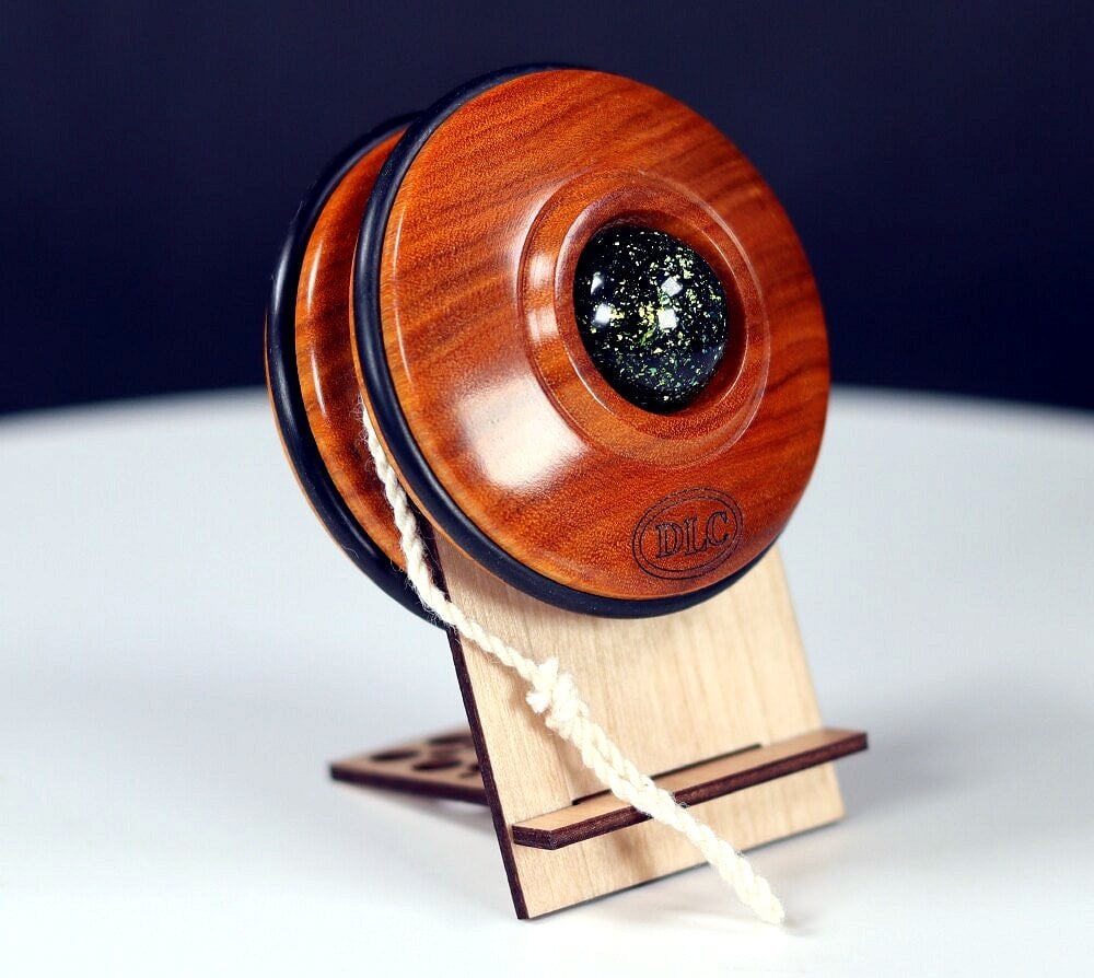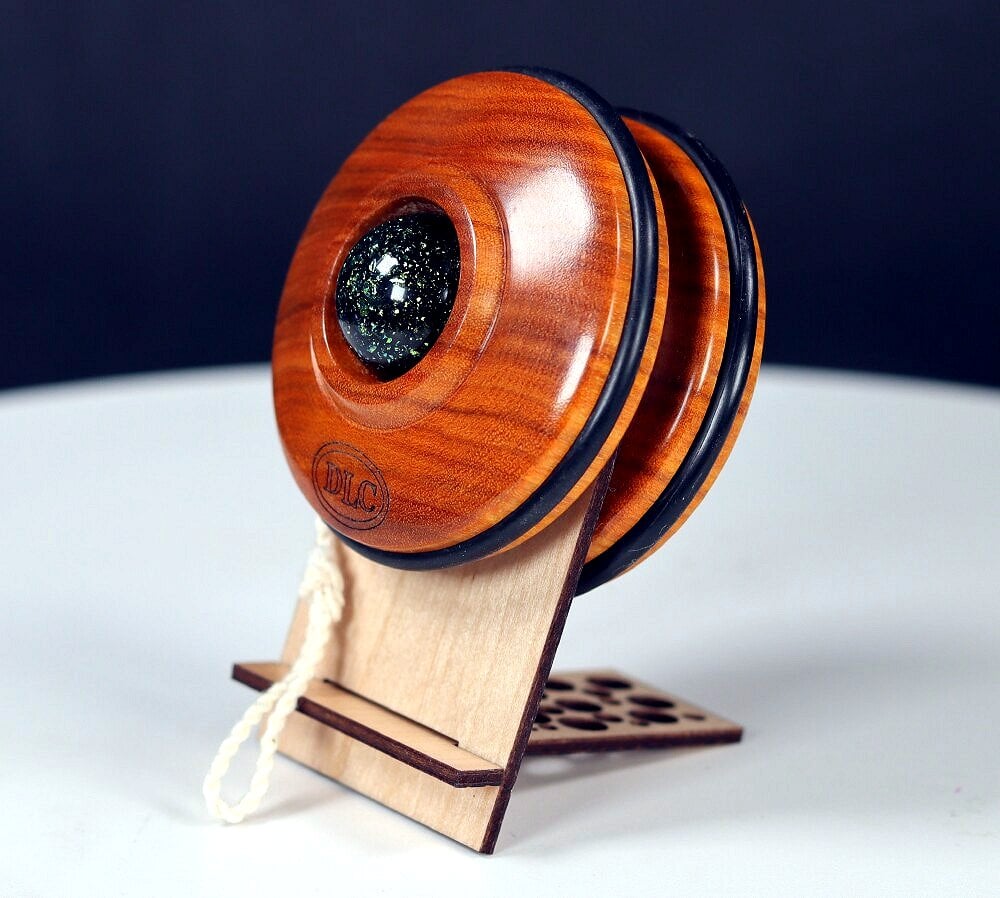 Completely handmade, lathe turned from a single block of wood, with no glue holding the sides and axle together. Fixed axle, with "nickel" width (~2.mm) string gap for responsive play, but will easily sleep and return with a slight string tug. Perfectly balanced and a super smooth player. Measures about 2.27" x 1.85" and weighs in at 72 grams (with string).