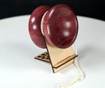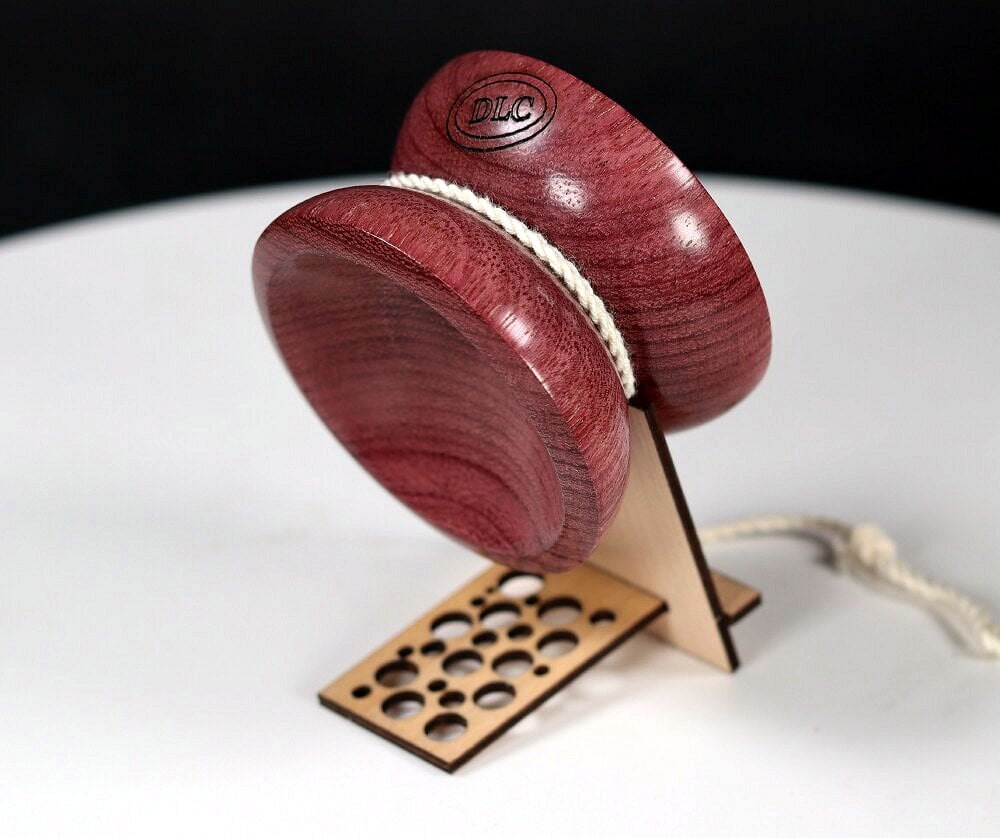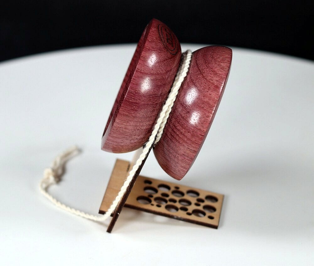 Completely handmade and lathe turned from a single block of wood, with no glue holding the sides and axle together. Fixed axle, with "nickel" width (~2mm) string gap for responsive play. Perfectly balanced and a smooth player. Measures about 2.27" x 1.45" and weighs in at 46 grams (with string).