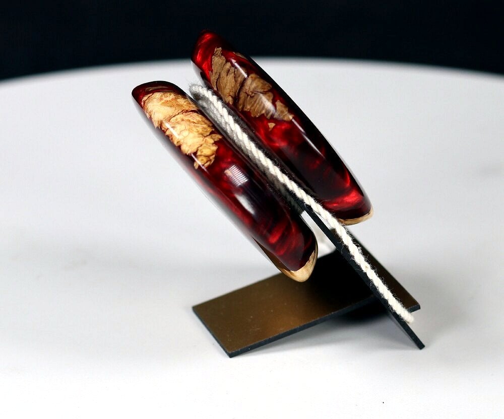 New, never played with and one-of-a-kind, highly polished casting of bright red acrylic with bits of Utah Boxelder Burl wood encased in the plastic, with DLC maker's mark on one side. Difficult to turn, but well worth the effort!