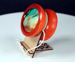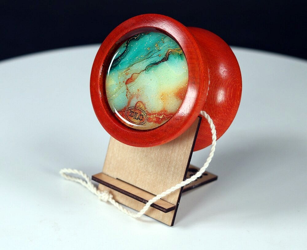 Completely handmade and lathe turned from a single block of wood, with no glue holding the sides and axle together. Fixed axle, with a "nickel" width (~2 mm) string gap. Perfectly balanced, spins true and is a smooth player. Measures about 2.27" x 1.45" and weighs in at 51 grams (with string).