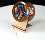 Fractal Blue River Table pogs, with DLC maker's mark embedded deeply into each side of this exotic English Walnut. The fractal (Lichtenberg burning) design/pattern is made with UV printing equipment, not electricity, nor any other form of dangerous woodburning process.
