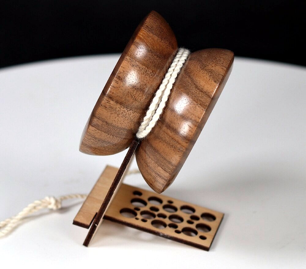 Completely handmade and lathe turned from a single block of wood, with no glue holding the sides and axle together. Fixed axle, with a "nickel" width (~2 mm) string gap. Perfectly balanced, spins true and is a smooth player. Measures about 2.25" x 1.50" and weighs in at 45 grams (with string).