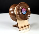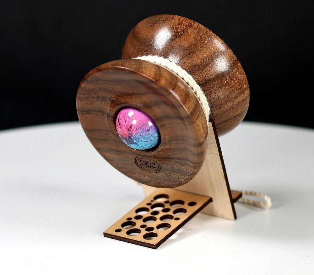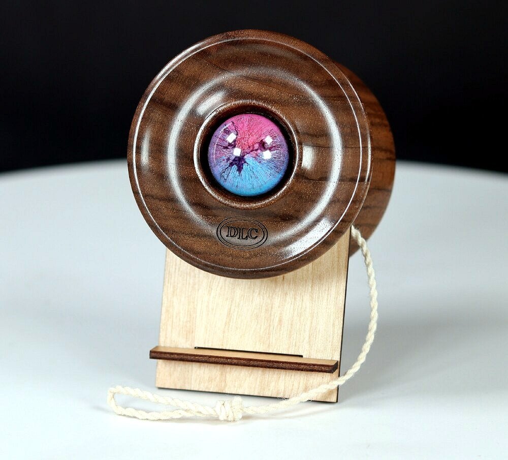 Completely handmade and lathe turned from a single block of wood, with no glue holding the sides and axle together. Fixed axle, with "nickel" width (~2mm) string gap for responsive play. Perfectly balanced and a smooth player. Measures about 2.25" x 1.50" and weighs in at 54 grams (with string).
