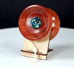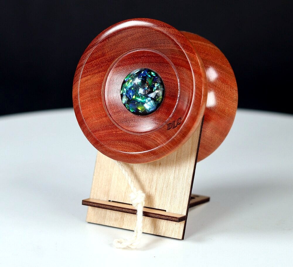Modestly laser engraved DLC maker's mark on one side of this exotic, rare and beautifully grained Australian Ironbark Eucalyptus yo-yo, with deep concave side embellishments and a matched pair of dichroic cabochons embedded into the wood.