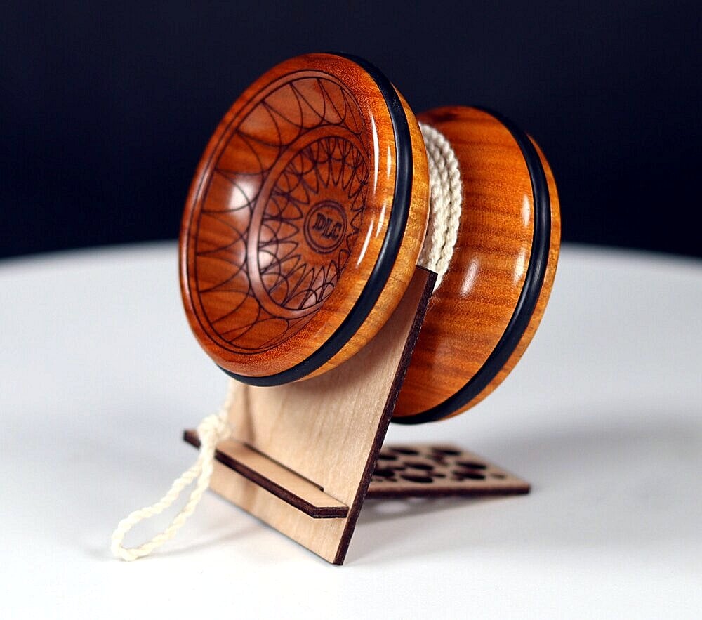 Unique laser engraved design with DLC maker's mark on each side of this exotic, rare and beautifully colored/grained Pernambuco (aka: Brazilwood) yo-yo, with 1/2" deep concave side embellishments.