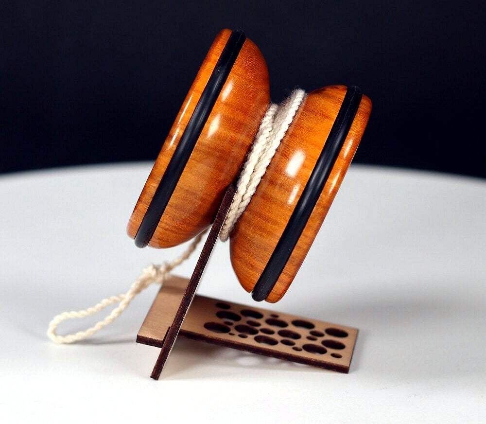 100% handmade and lathe turned from a single block of wood, with no glue holding the sides and axle together. Fixed axle, with "nickel" width (~2mm) string gap for responsive play. Sleeps easily too. Perfectly balanced and a smooth player. Measures about 2.25" x 1.52" and weighs in at 52 grams (with string).