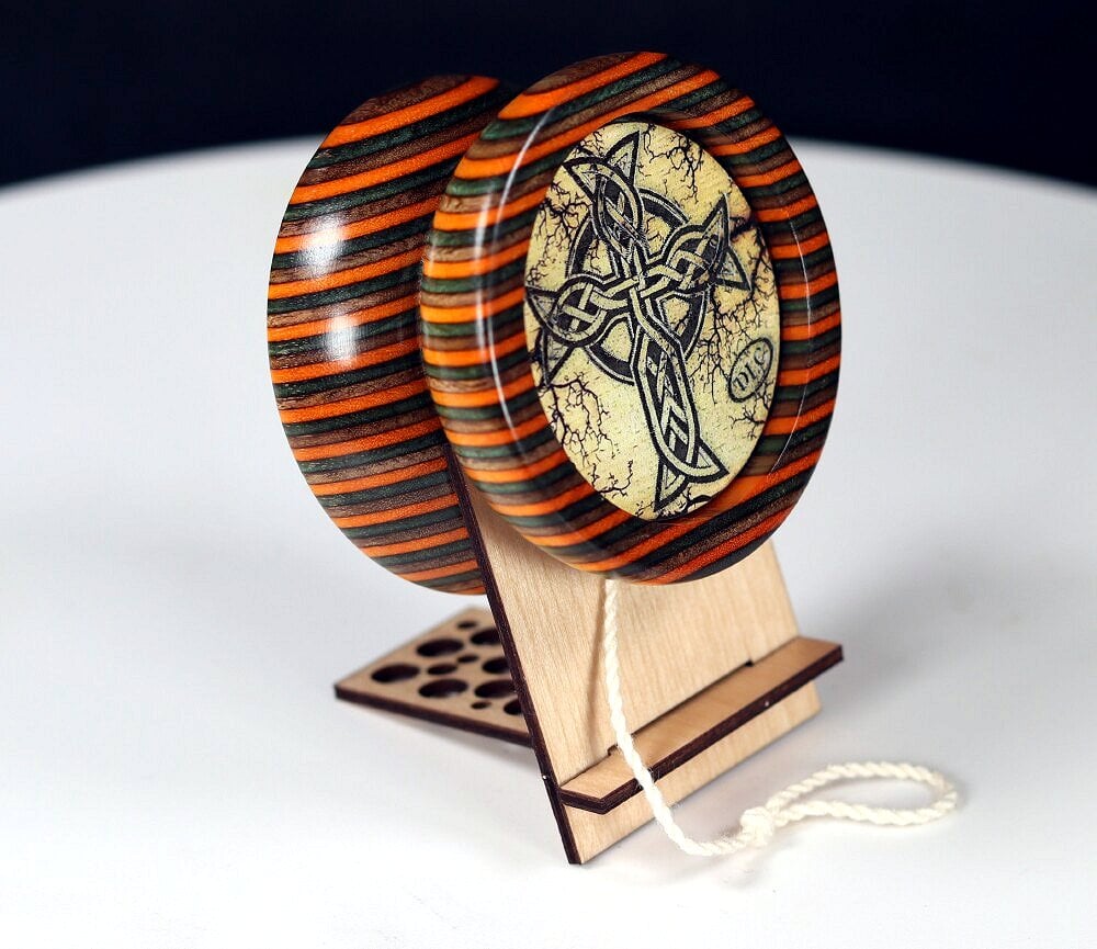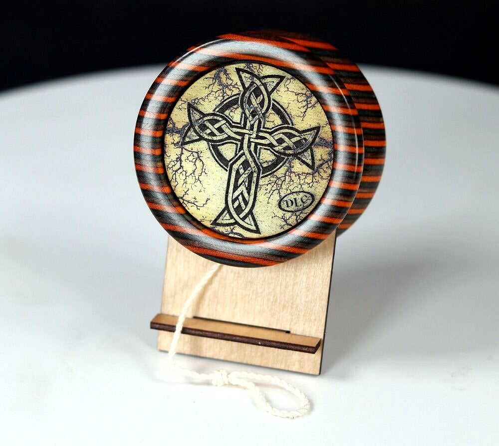 Fractal lightning pogs with laser engraved Celtic Cross and DLC maker's mark embedded deeply into each side of this colorful SpectraPly wood.