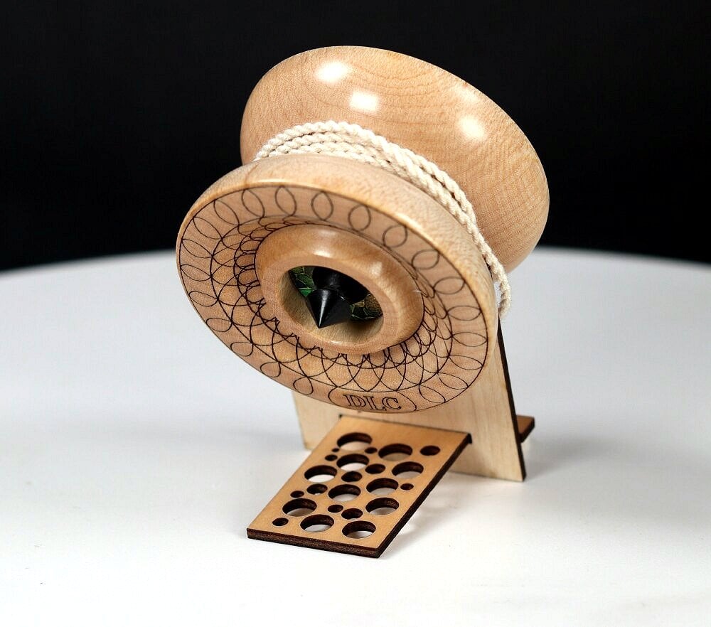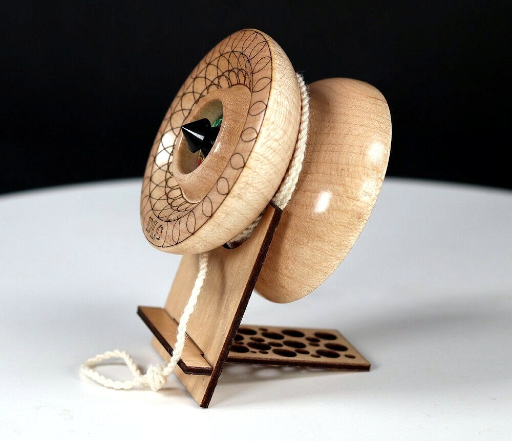 Completely handmade and lathe turned from a single block of wood, with no glue holding the sides and axle together. Fixed axle, with a "nickel" width (~2 mm) string gap. Perfectly balanced and a true/smooth spinner, sleeping easily, and returns with a slight string pull. Measures about 2.25" x 1.40" and weighs in at 44 grams (with string).