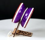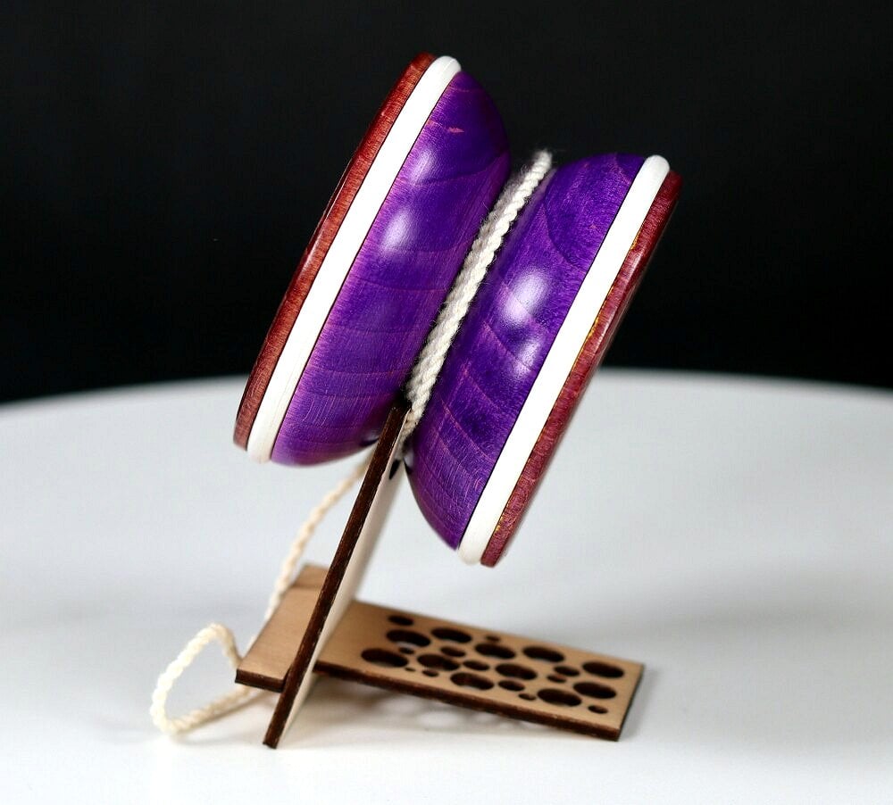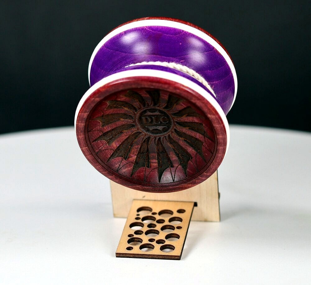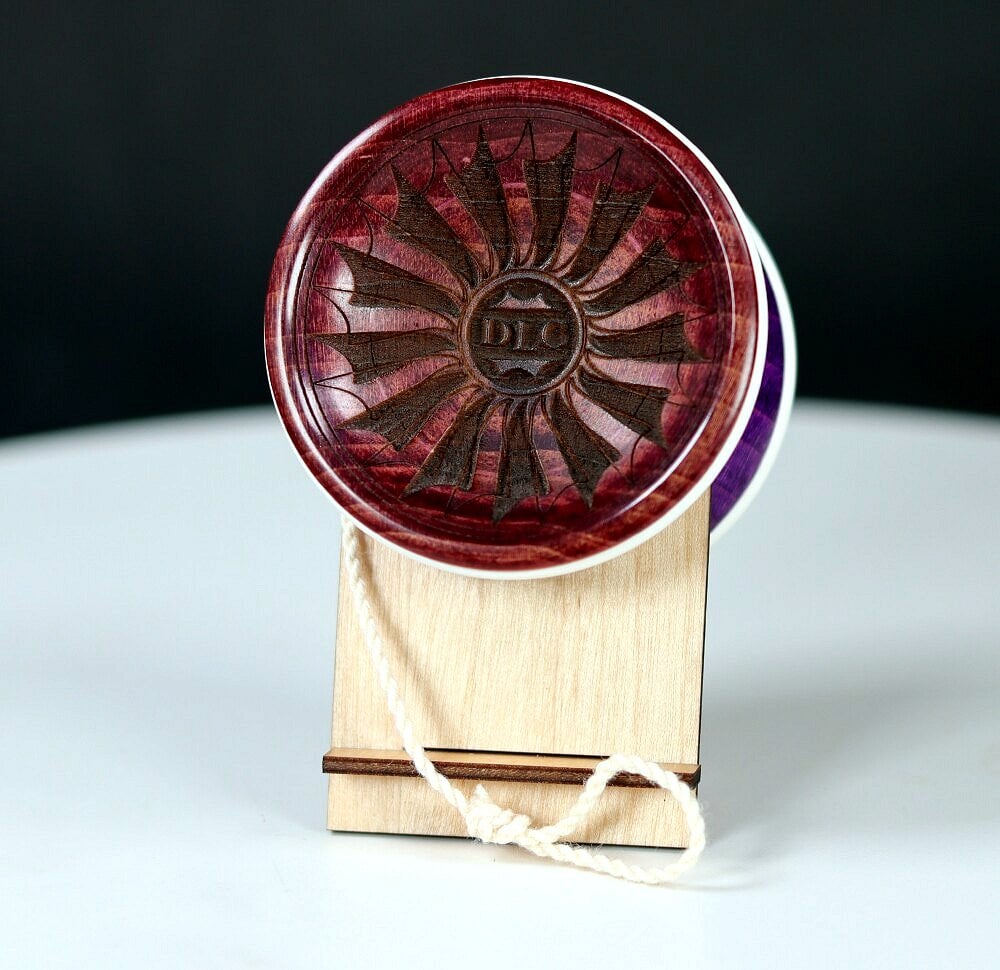 All original laser engraved art on both sides, with DLC maker's mark on this New England Hard Maple yo-yo, dyed burgundy & purple. White rubber impact-rings help absorb hard floor hits and minimize damage.
