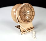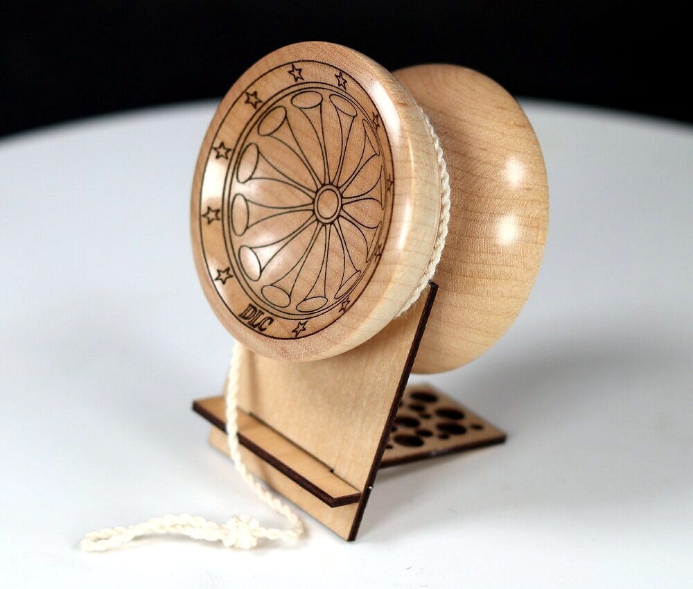 Completely handmade and lathe turned from a single block of wood, with no glue holding the sides and axle together. Fixed axle, with "nickel" width (~2mm) string gap for responsive play. Perfectly balanced and a smooth player. Measures about 2.25" x 1.50" and weighs in at a lightweight 41 grams (with string).