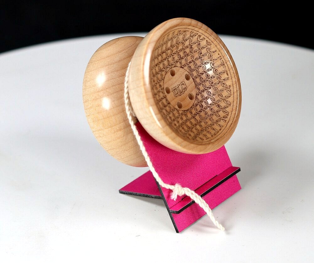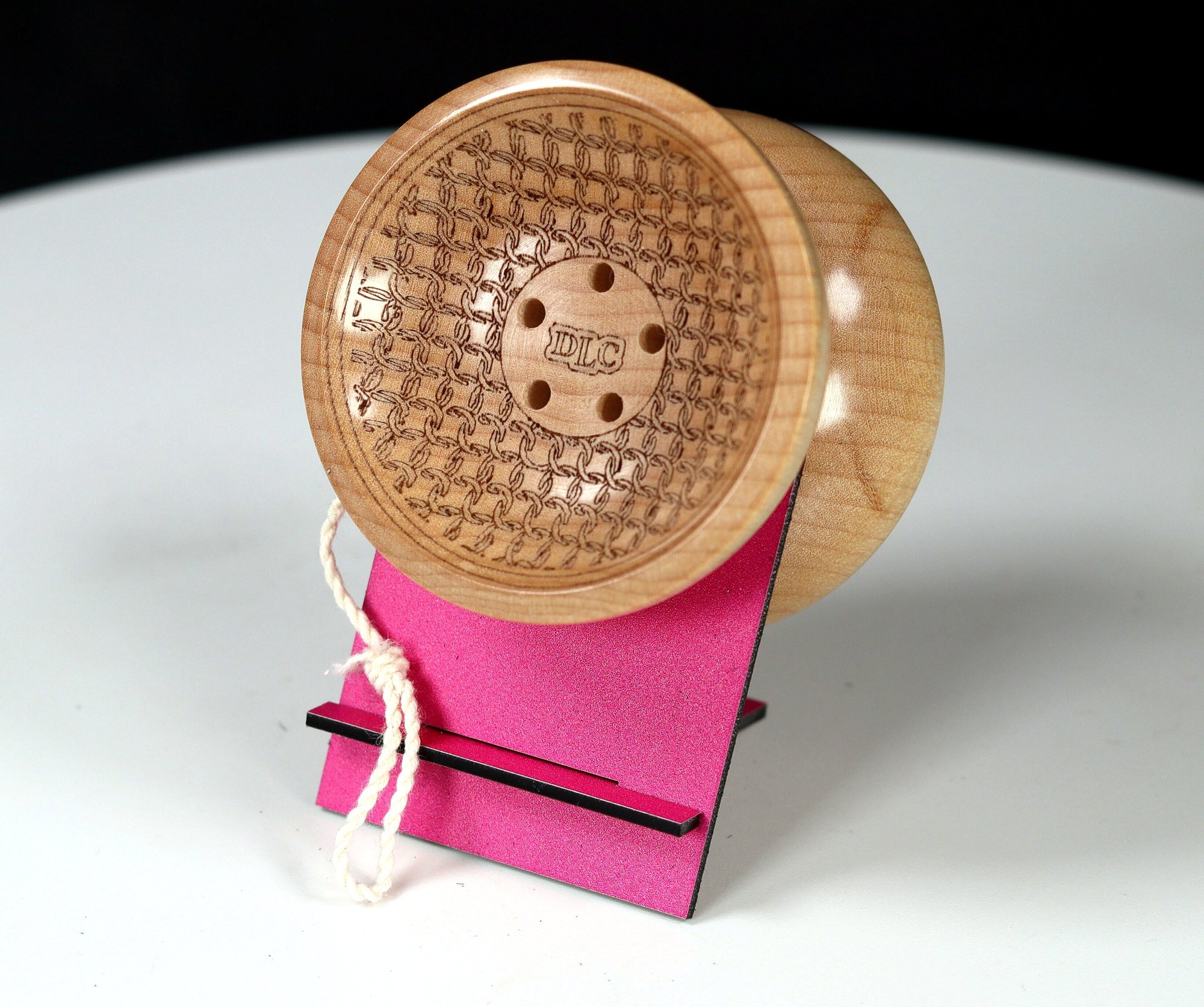 Chain Mail laser engravings, along with the Davidson LatheCraft maker's mark, on each side of the deep concave surfaces on this New England hard Maple. Brake holes surrounding the axle help center the string in the gap channel, and enable a very smooth return.