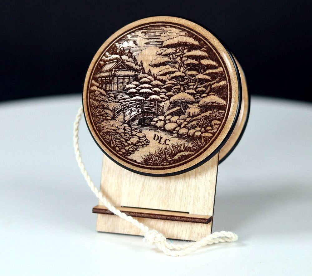 Unique Japanese Garden art scene, with Davidson LatheCraft maker's mark laser engraved onto each side of this New England hard Maple.