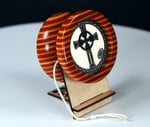 Completely handmade and lathe turned from a single block of wood, with no glue holding the sides and axle together. Fixed axle, with a "nickel" width (~2 mm) string gap. Perfectly balanced, spins true and is a smooth player. Measures about 2.30" x 1.35" and weighs in at 49 grams (with string).
