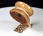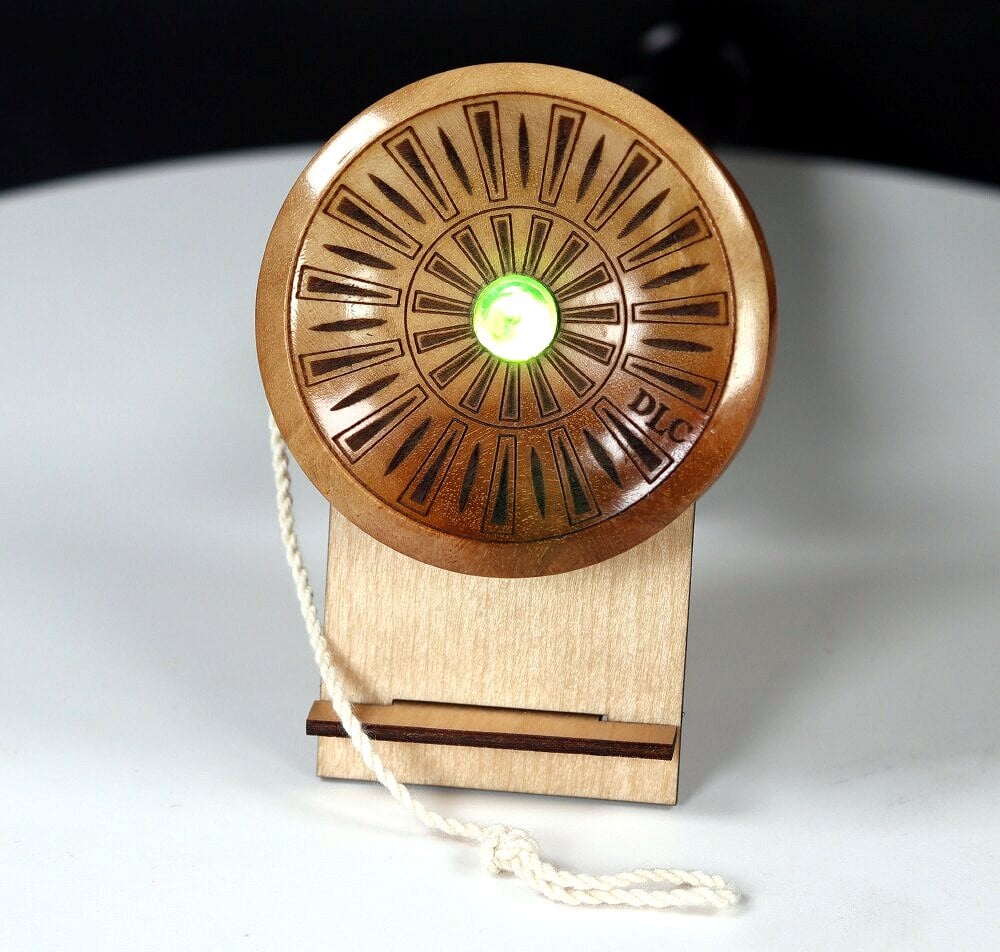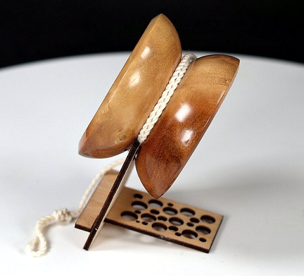 100% handmade and lathe turned three-piece design. Fixed ACRYLIC axle, with "nickel" (7 playing cards) width (~2mm) string gap for responsive play. Sleeps easily too. Perfectly balanced and a very smooth player. Measures about 2.33" x 1.35" and weighs in at 58 grams (with string).