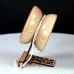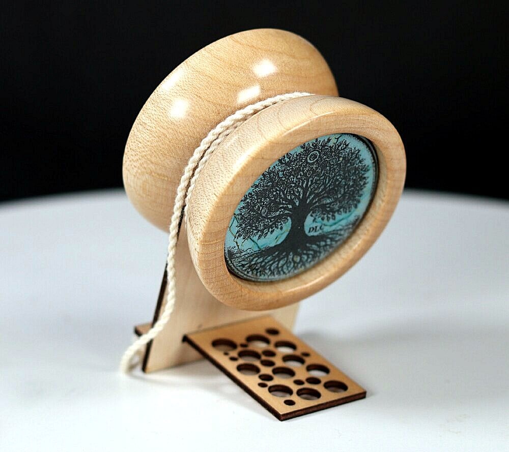 Completely handmade and lathe turned from a single block of wood, with no glue holding the sides and axle together. Fixed axle, with a "nickel" width (~2 mm) string gap. Perfectly balanced, spins true and is a smooth player. Measures about 2.25" x 1.50" and weighs in at 52 grams (with string).