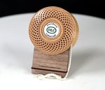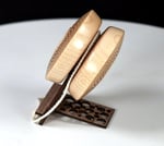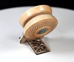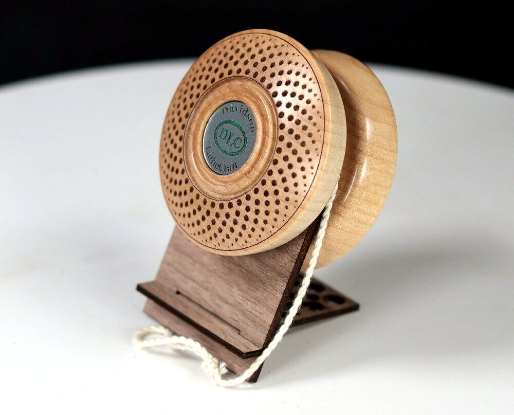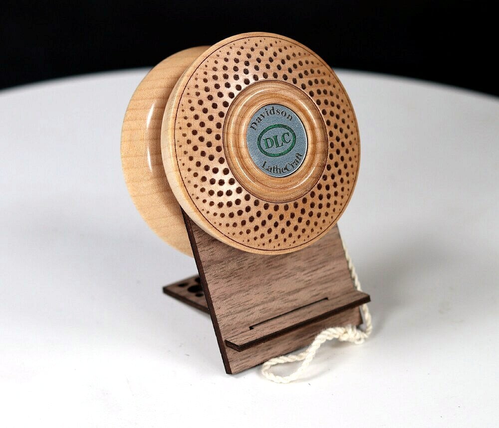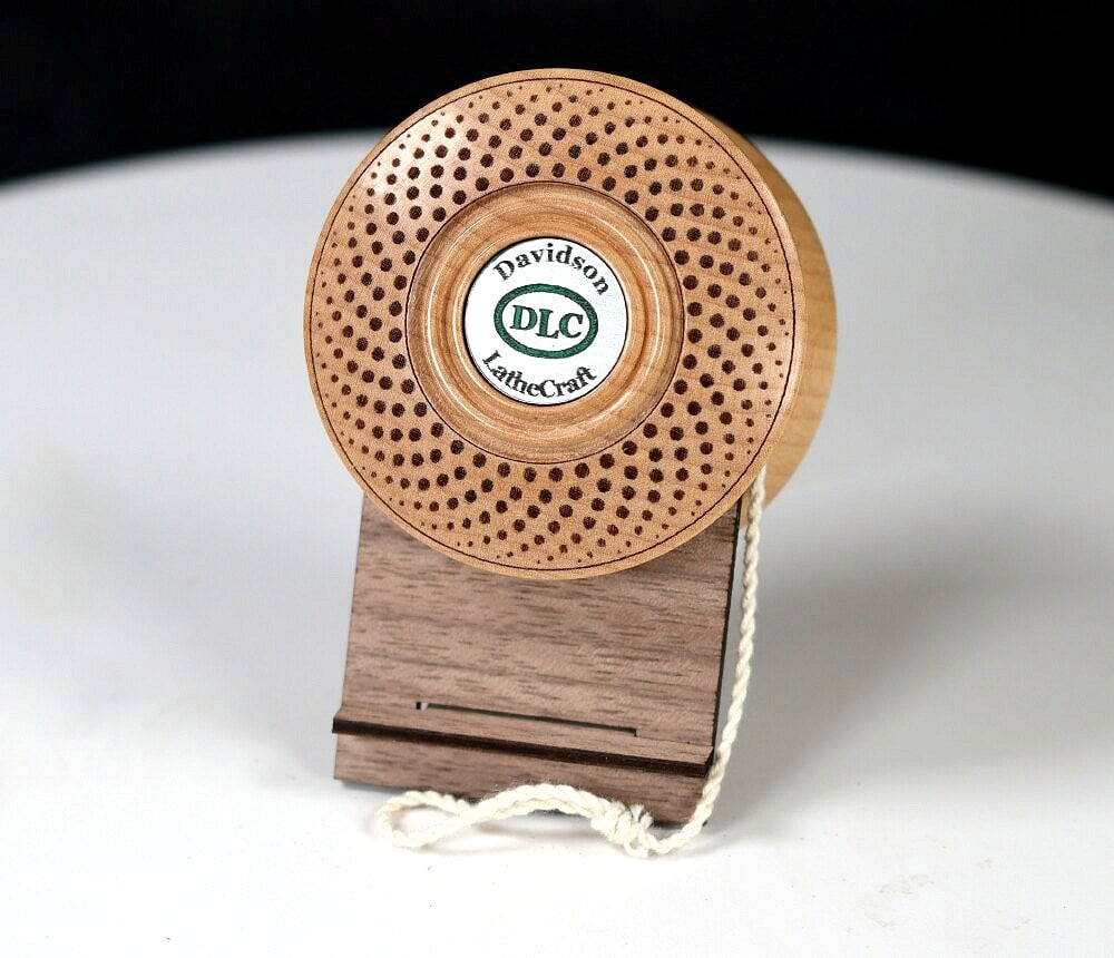 Pinwheel dots artwork laser engraved onto each side, with Davidson LatheCraft (DLC) maker's mark cabochon center pieces, on this New England hard Maple.