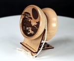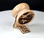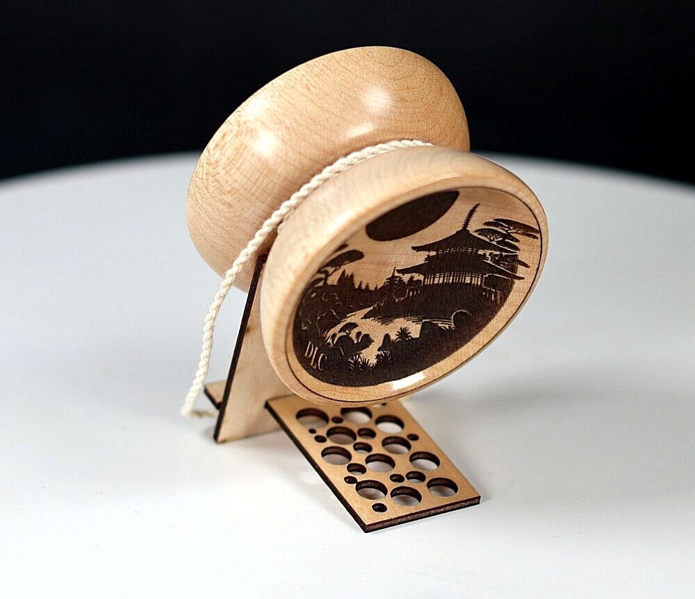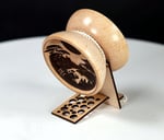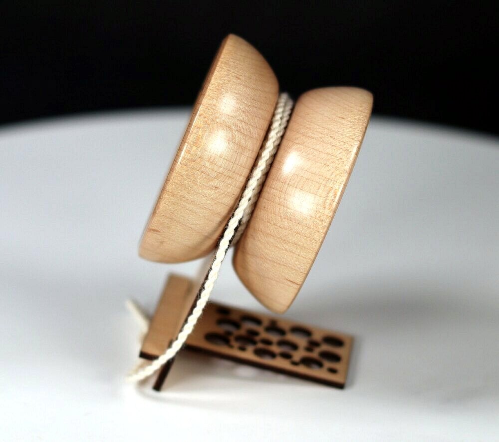 Completely handmade and lathe turned from a single block of wood, with no glue holding the sides and axle together. Fixed axle, with "nickel" width (~2mm) string gap for responsive play. Perfectly balanced and a smooth player. Measures about 2.25" x 1.50" and weighs in at a lightweight 36 grams (with string).