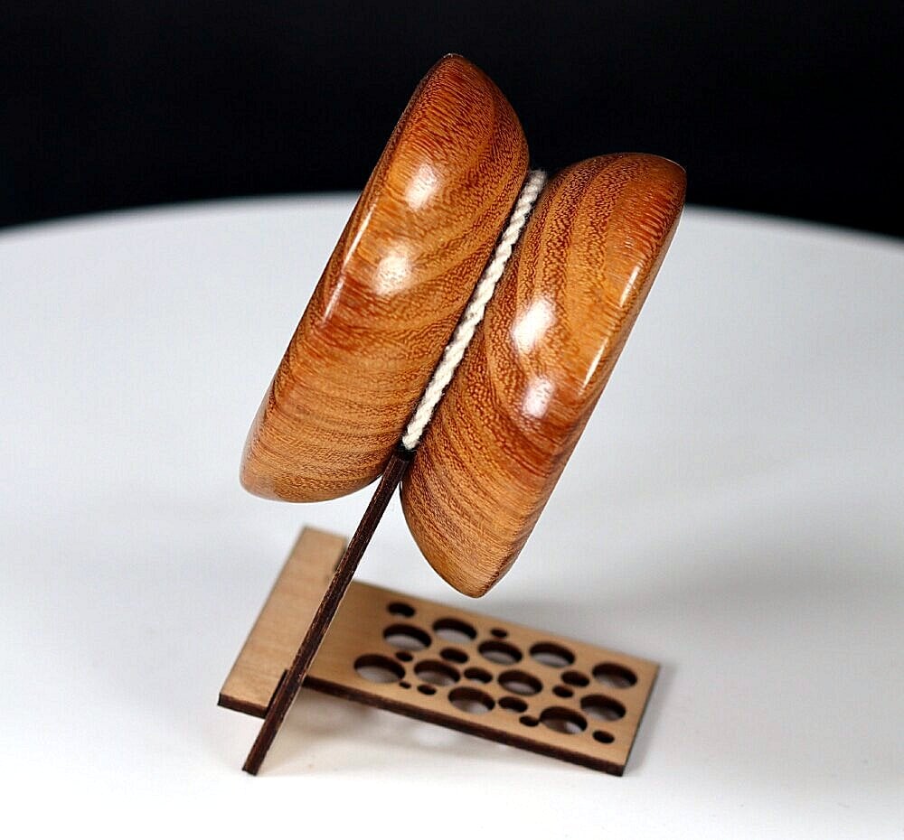 100% handmade and lathe turned from a single block of wood, with no glue holding the sides and axle together. Fixed axle, with a "nickel" width (~2 mm) string gap. Perfectly balanced, spins true and is a very smooth player. Measures about 2.27" x 1.35" and weighs in at 53 grams (with string).
