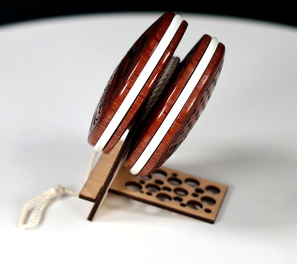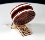 Completely handmade and lathe turned from a single block of wood, with no glue holding the sides and axle together. Fixed axle, with "nickel" width (~2mm) string gap for responsive play, but sleeps equally well . Perfectly balanced and a very smooth player. Measures about 2.24" x 1.40" and weighs in at 61 grams (with string).